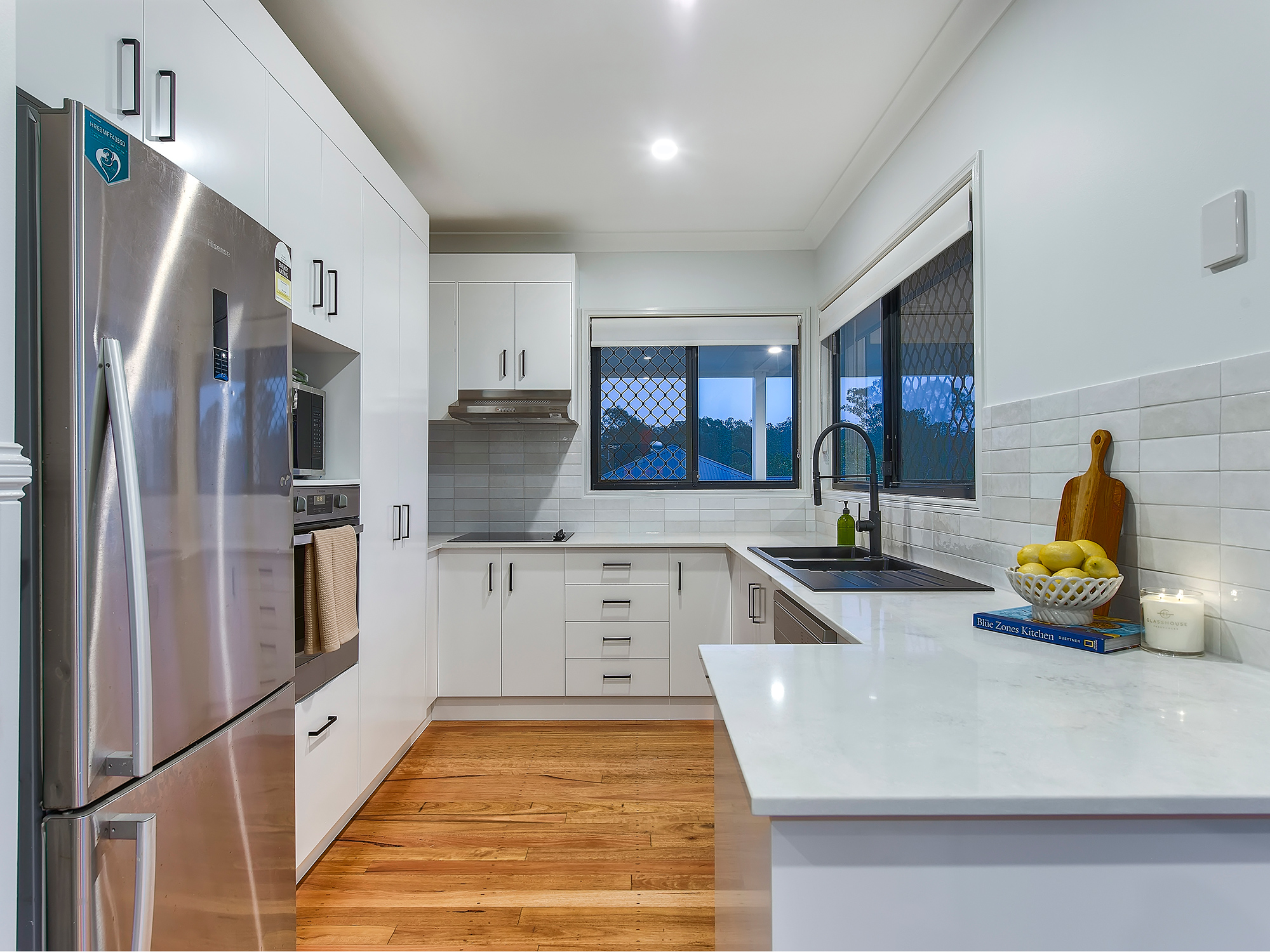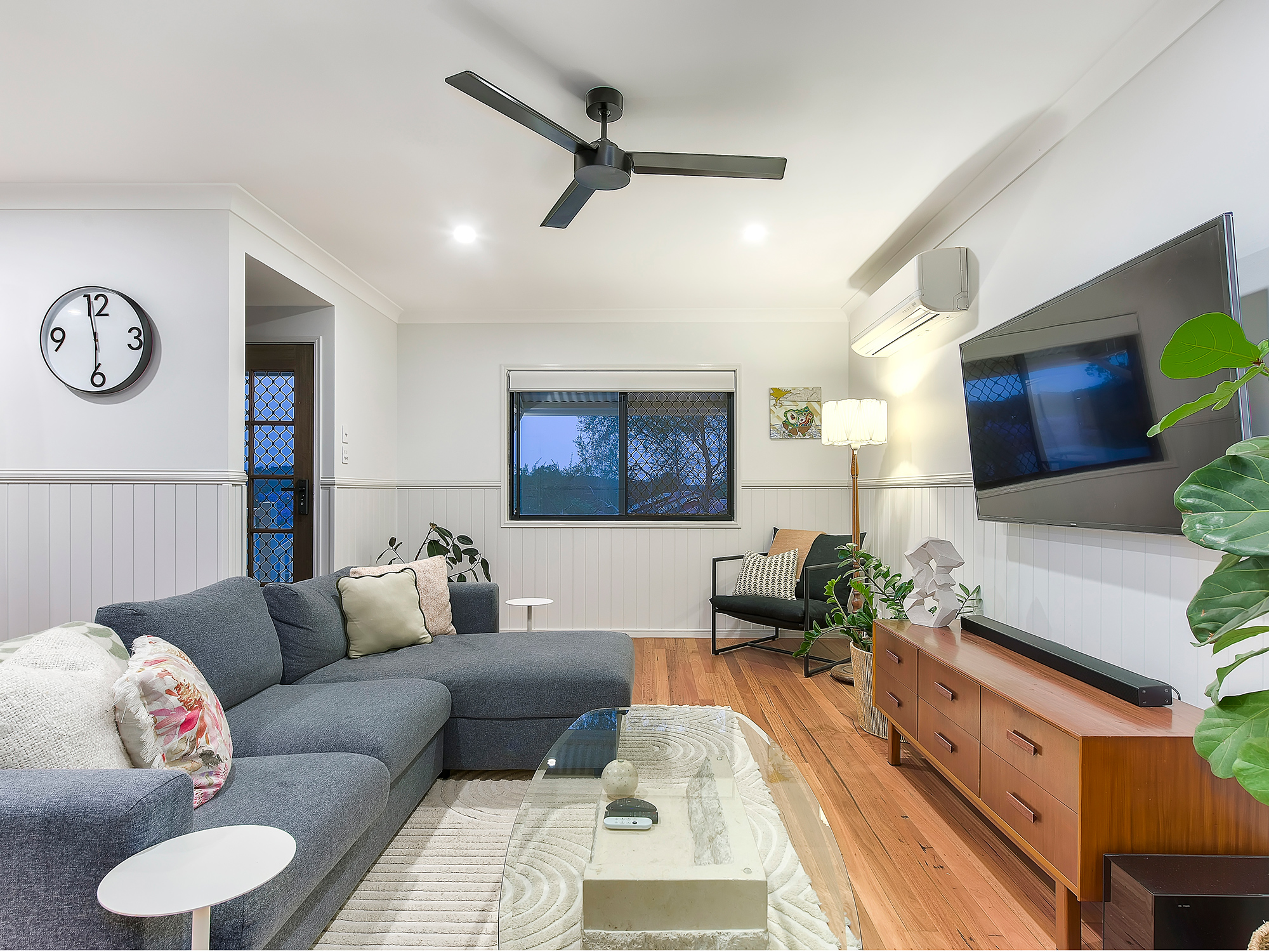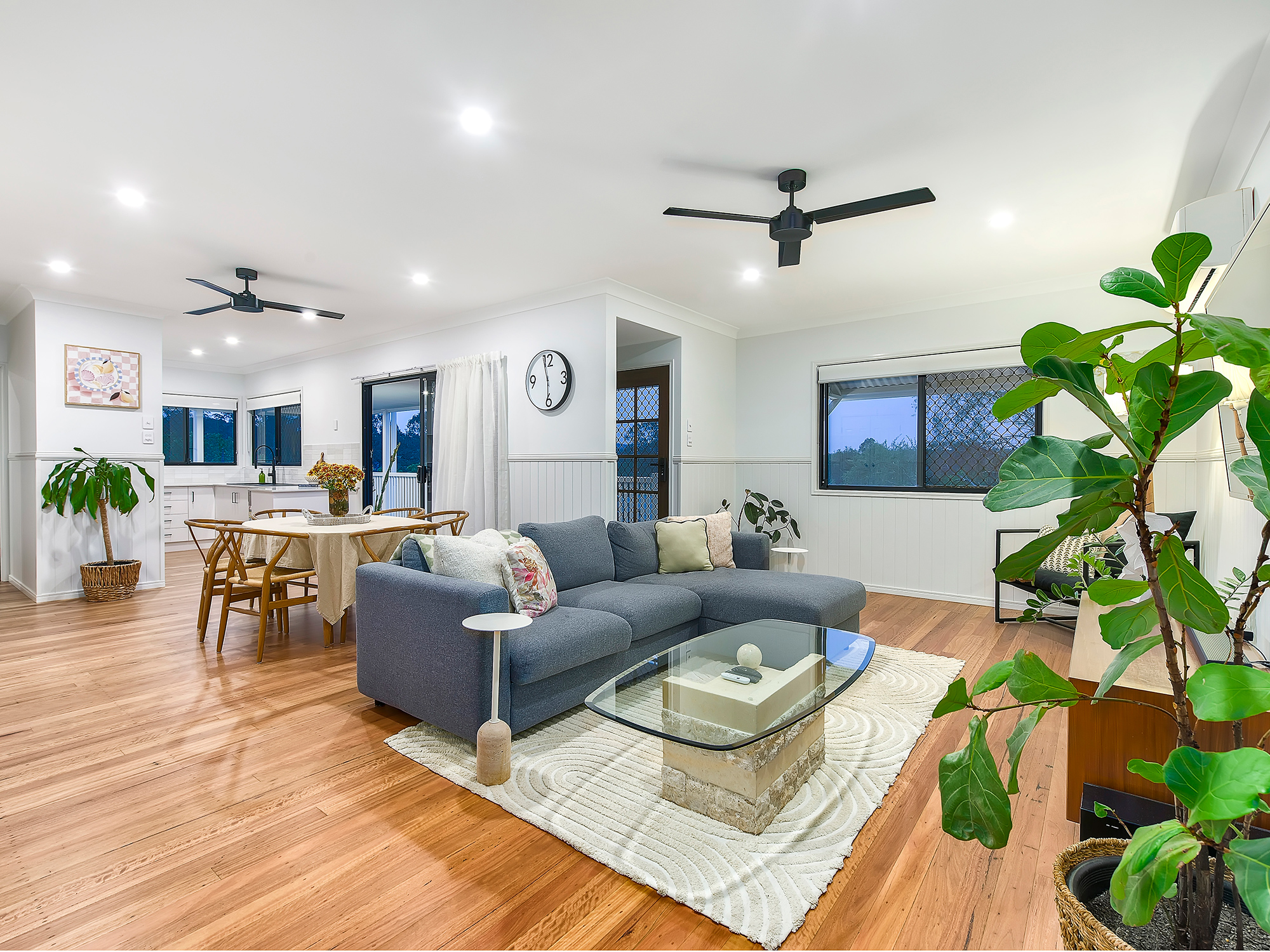 Privately set behind white picket fencing and a gated entry, fresh paint and manicured landscaping frame a replica Queenslander home with a gorgeous wrap-around verandah providing quintessential hospitality. Polished timber floors and VJ wainscoting bring timeless sophistication into an airy open-plan layout with living and dining both enjoying excellent natural light. Boasting a refined update, a plethora of timeless cabinetry with exceptional storage and stainless appliances define the kitchen, wrapped in gleaming stone and beautiful subway tiling.