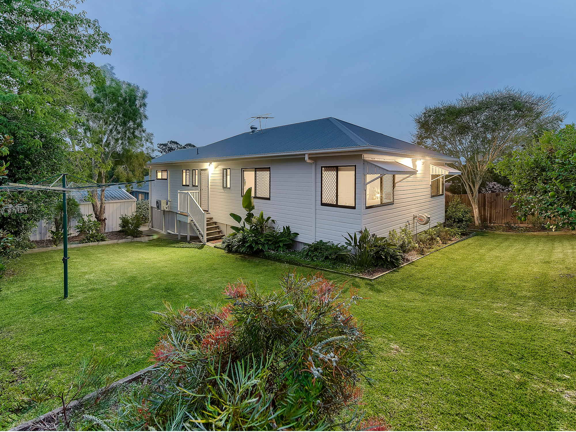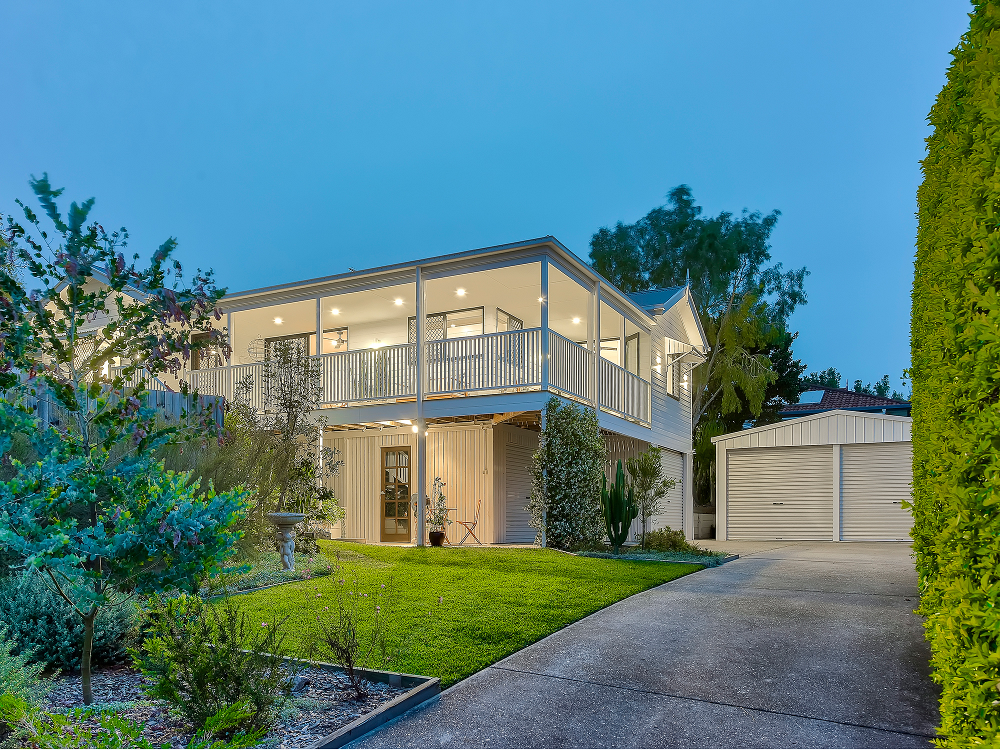 - 670m2 - Renovated replica Queenslander with gorgeous horizon outlook - Upgraded from top to toe with immaculate exterior and gated entry - Polished timber floors and VJ wainscoting - Open-plan, air-conditioned living and dining - New kitchen with superb storage, quality appliances and stone - Wrap-around alfresco entertaining with sweeping panoramic views - Four built-in bedrooms with plush carpet and ceiling fans - Air-conditioned master including walk-in robe and ensuite - New family bathroom with great vanity storage and separate bath - European laundry - Double garage plus large double bay shed - Automated gated driveway -Private cul-de-sac position close to shops, schools and transport
